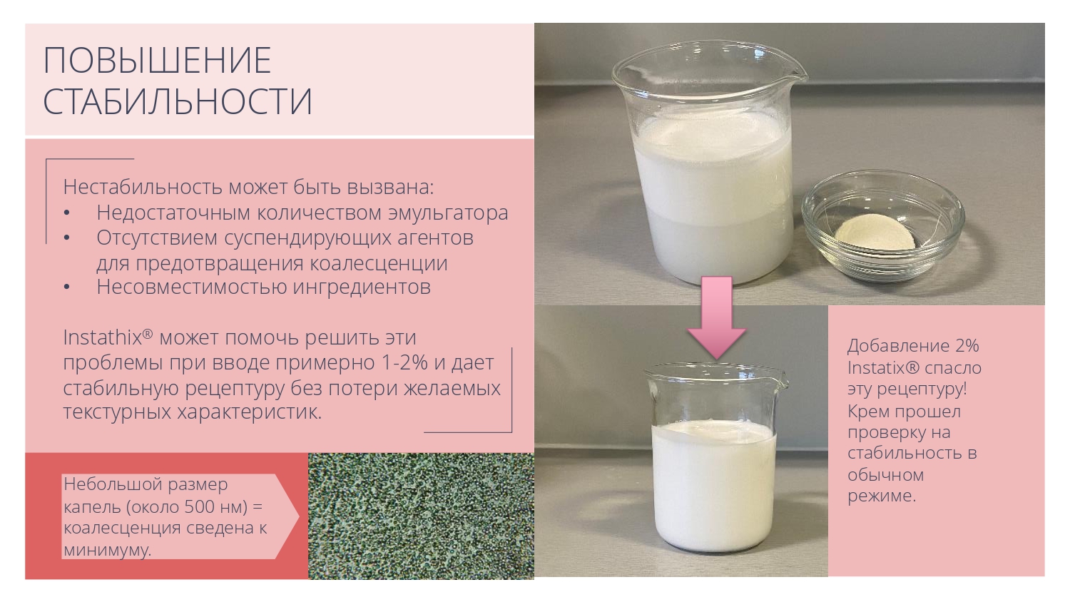 Instathix® представляет собой концентрированную порошковую смесь натуральных эмульгаторов, стабилизаторов и модификаторов текстуры, позволяющую легко получать стабильные эмульсий типа "масло-в-геле". С ним можно создавать как жидкие сыворотки с шелковистой гладкой текстурой, так и более насыщенные и густые кремы и баттеры. Кроме того, этот ингредиент можно использовать для решения проблем, связанных с повышением вязкости или улучшением стабильности и текстуры уже готовых рецептур.